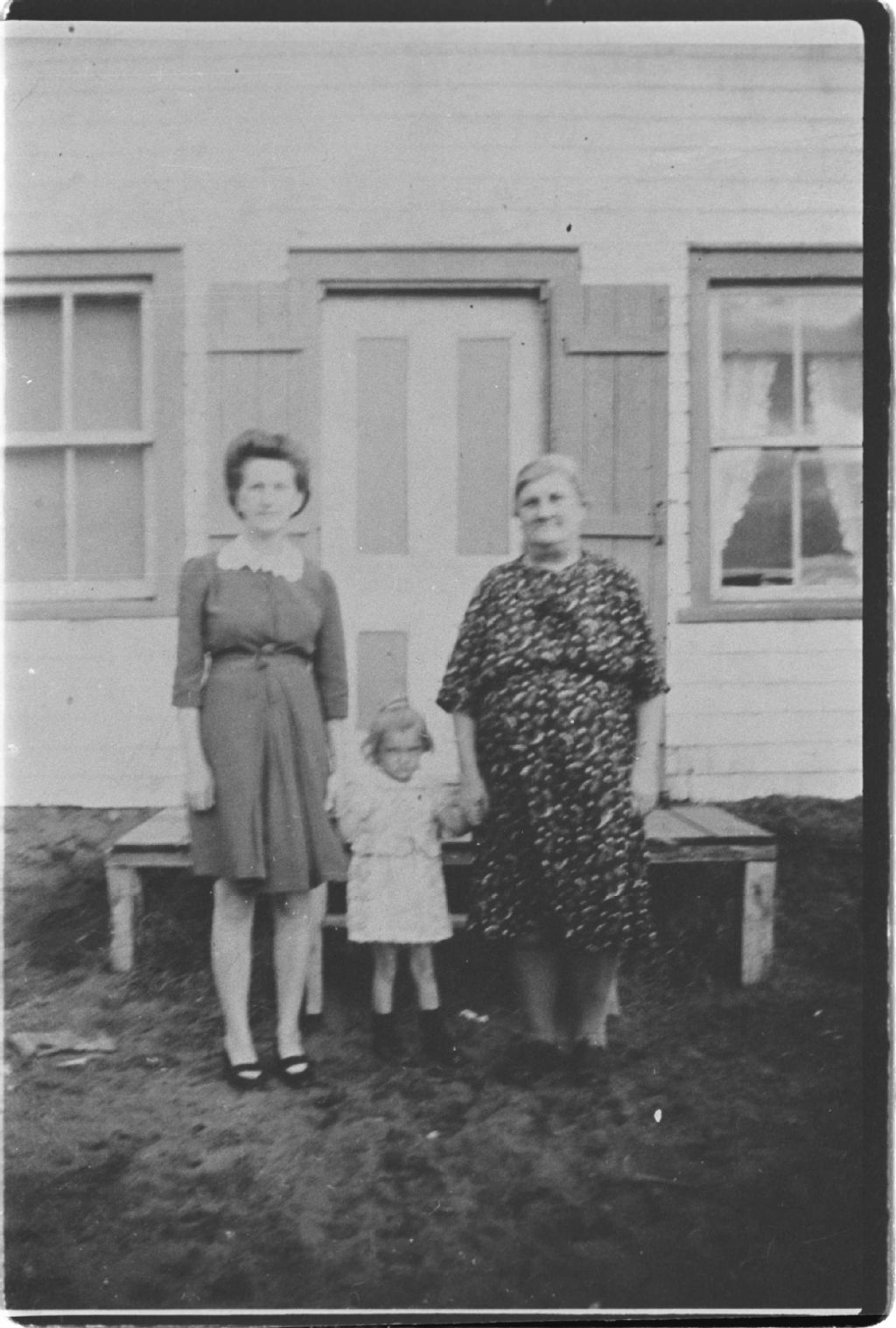Lucille Beaudin, Jeannine Jobin et Diane Lejeune devant la maison de Georges Beaudin