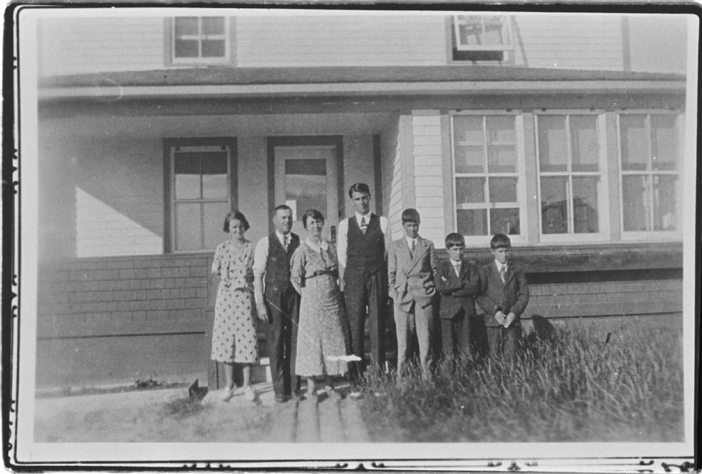 Marthe, Donald, Ludovic, Harold et Omer Gallienne devant la maison de Donald Gallienne