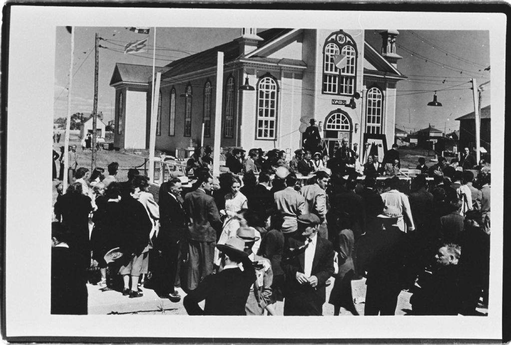Foule devant l'église Saint-Joseph lors des fêtes du tricentenaire de Sept-Îles