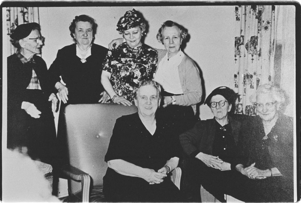 De gauche à droite : Alphonsine Vigneault, fille de Paul-Édouard, Catherine Buckle, épouse de Clovis Vigneault, Isabelle Byrne, épouse de Rosario Vigneault, Georgianna Vigneault, fille de Paul-Édouard. Assises, de gauche à droite : Alphonsine Petitpas, épouse de Dominique-Arthur Vigneault, Eugénie Vigneault, fille de Paul-Édouard et Alphonsine Jean, épouse d'Héliodore Vigneault.