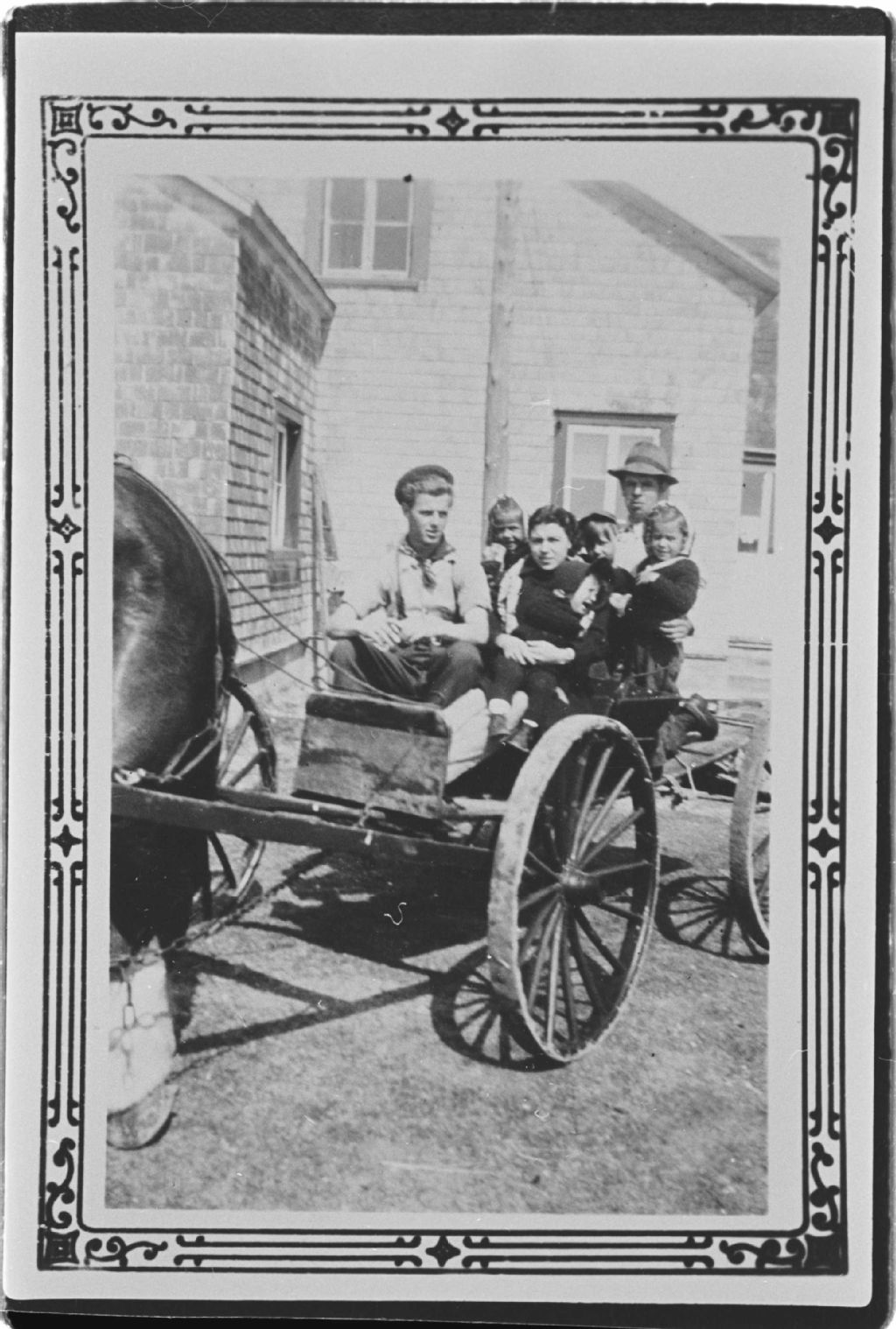 Des gens de Sept-Îles sur une charrette, Négatif reproduit en 1984 (original créé vers 1940), Archives nationales à Sept-Îles, Collection Société historique du Golfe, (09N,P6,S3,D4,P822), Société historique du Golfe.