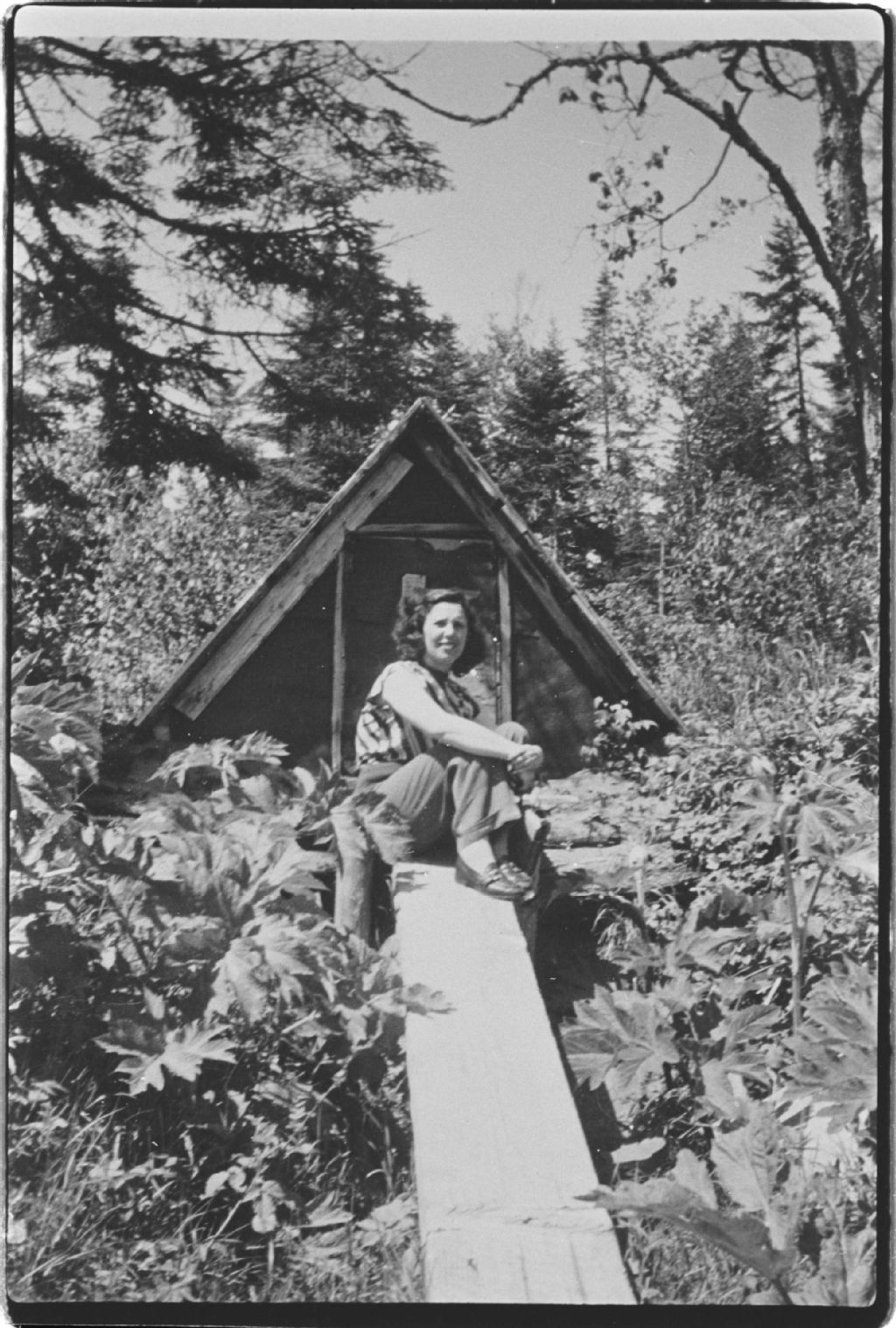 Cécile Cormier, épouse d'Omer Gallienne, devant une glacière à Sept-Îles