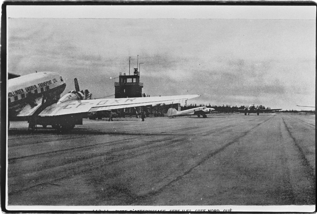 Avion de la Hollinger Ungava Transport à l'aéroport de Sept-Îles, Négatif reproduit en 1984 (original créé vers 1950), Archives nationales à Sept-Îles, Collection Société historique du Golfe, (09N,P6,S3,D4,P98), Société historique du Golfe.