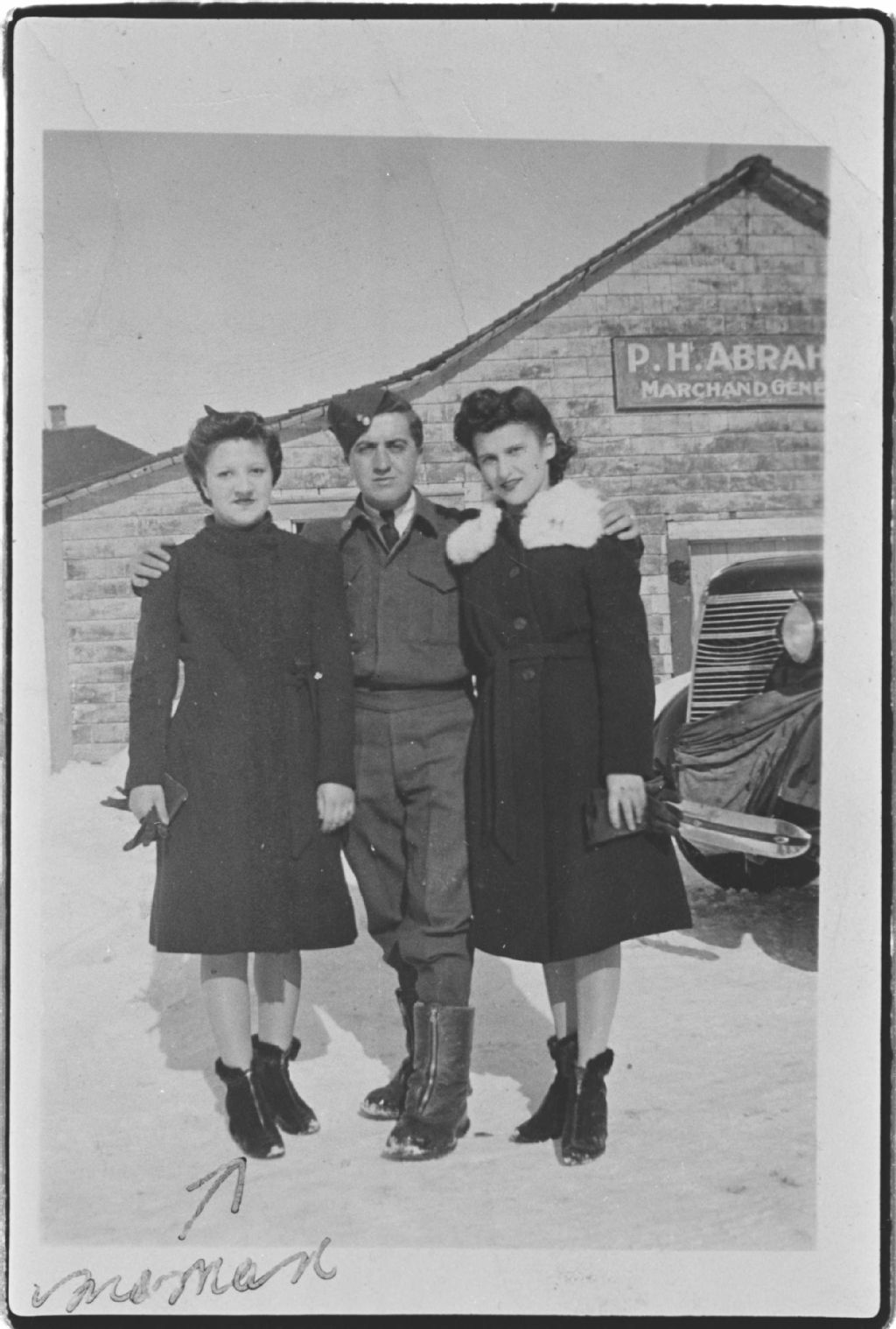 Blanche Bourgeois, Gérard Goyer et Bernadette Migneault devant le magasin général P.H. Abraham