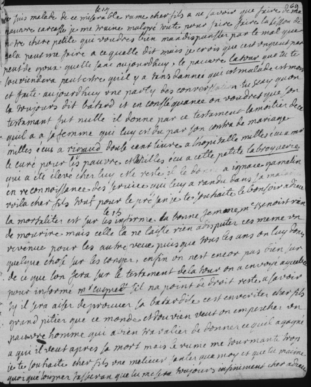 Madame Benoît est décédée. Le testament de Monsieur La Tour (Jean Latour de Foucault) est toujours contesté et on a envoyé à Québec une demande à Monsieur Cugnet (François-Étienne Cugnet) à ce sujet. Reste à savoir si la bâtardise pourra être prouvée