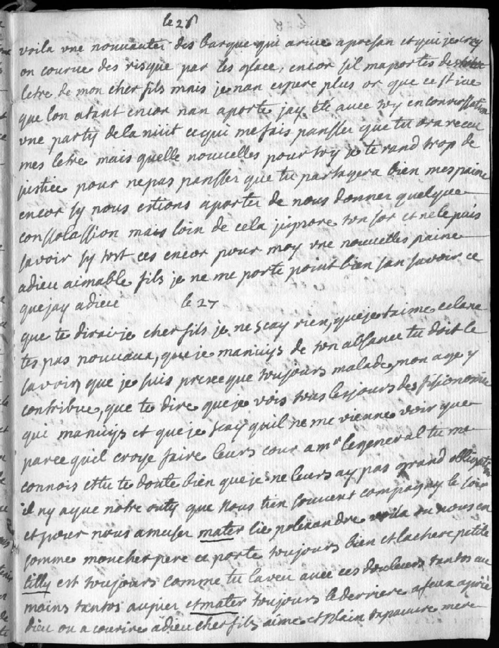 Madame Bégon (Marie-Isabelle-Élisabeth Bégon) s'ennuie de son cher «fils» (Honoré Michel de Villebois de La Rouvillière) et des gens qui viennent la voir pour avoir des faveurs du général (Roland-Michel Barrin de La Galissonière dit marquis de La Galissonière). Elle est heureuse d'avoir Outy pour la distraire et Mater (Catherine Legardeur de Repentigny), qui lit chaque soir «Polexandre». Son père (Étienne Rocbert de La Morandière) et la petite Tilly (Marie-Anne Legardeur de Moncerville Tilly) se portent bien