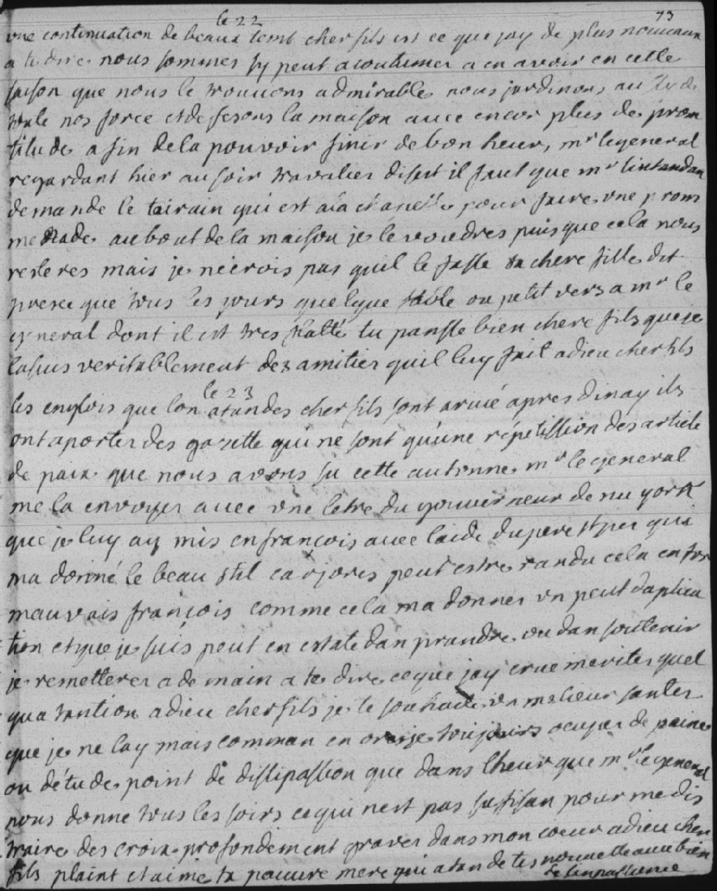 Les Anglais sont arrivés aujourd'hui avec des gazettes que le général (Roland-Michel Barrin de La Galissonière dit marquis de La Galissonière) a fait transmettre à Madame Bégon (Marie-Isabelle-Élisabeth Bégon) avec une lettre du gouverneur de New York lui demandant de les traduire en français, avec l'aide du père Saint-Pé (Jean-Baptiste de Saint-Pé)