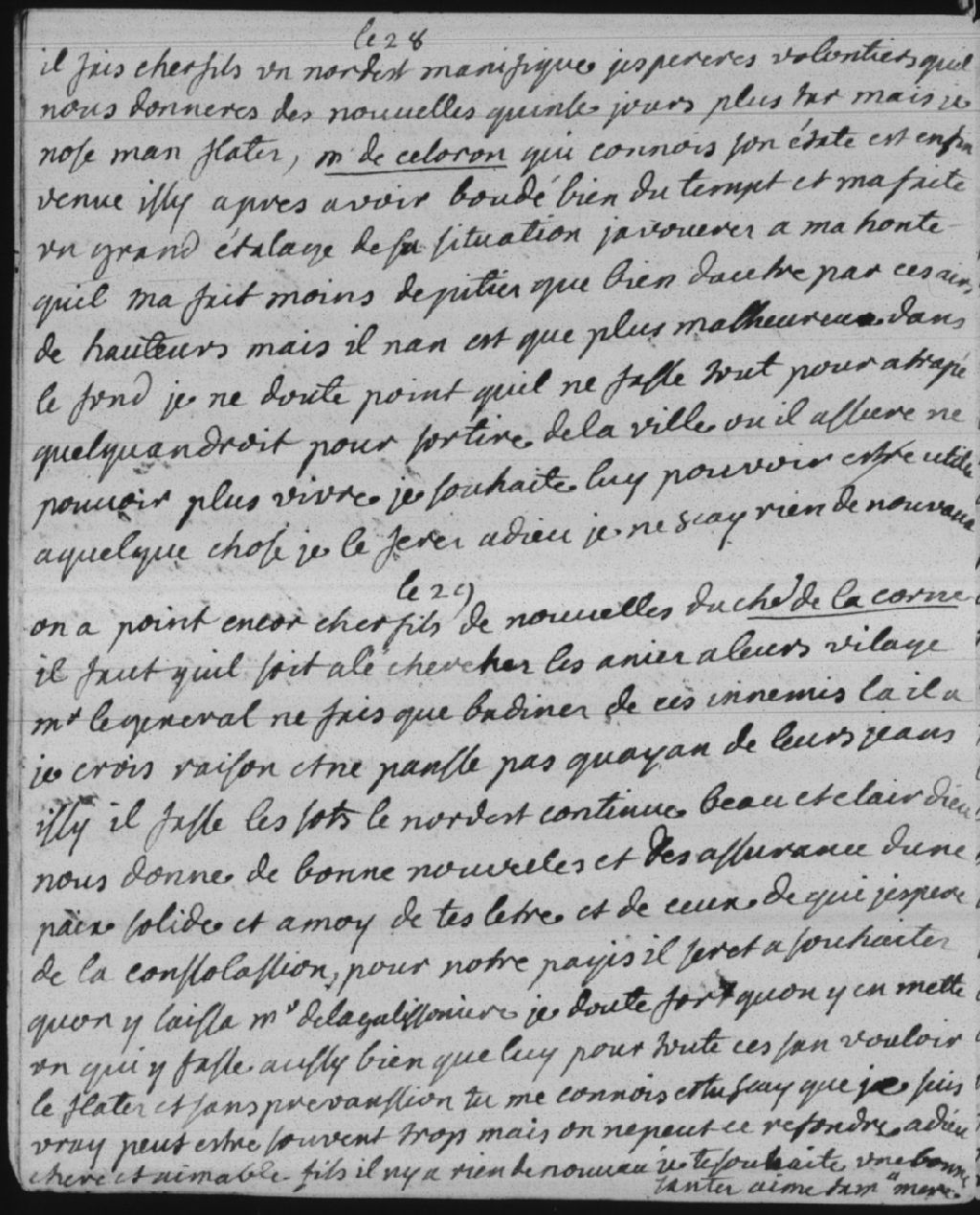 Monsieur Céloron (Pierre-Joseph Céloron de Blainville) est venu chez Madame Bégon (Marie-Isabelle-Élisabeth Bégon) pour lui expliquer sa situation plutôt difficile. Il espère trouver un emploi qui le mènera en dehors de la ville, car, dit-il, il ne peut plus y vivre