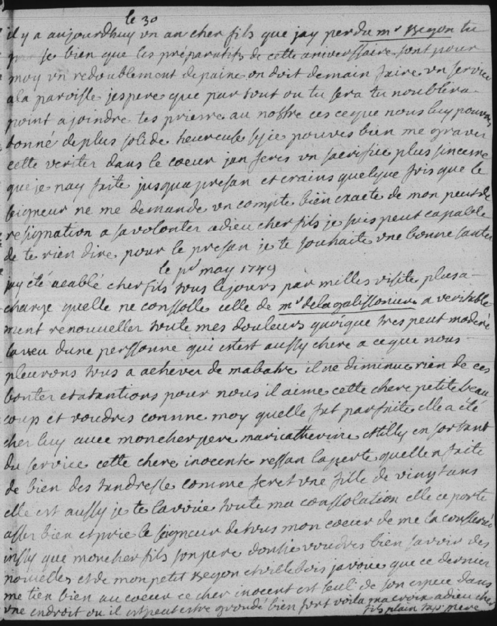 Madame Bégon (Marie-Isabelle-Élisabeth Bégon) relate les nombreuses visites qui lui ont été faites pour l'anniversaire du décès de son mari (Claude-Michel Bégon de la Cour), mais aucune ne l'a touchée aussi profondément que celle de La Galissonière (Roland-Michel Barrin de La Galissonière dit marquis de La Galissonière). La petite (Marie-Catherine de Villebois de la Rouvillière) s'est rendue chez lui, accompagnée de Tilly (Marie-Anne Legardeur de Moncerville Tilly) et du père de Madame Bégon (Étienne Rocbert de la Morandière)