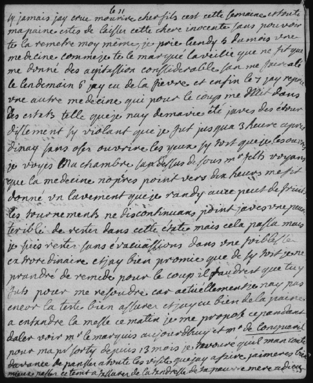 Madame Bégon (Marie-Isabelle-Élisabeth Bégon) reçut le 5 mai une saignée de Monsieur Feltz (Charles-Elemy-Joseph-Alexandre-Ferdinand Feltz), qui ne lui enleva pas son mal. Le lendemain, elle eut de la fièvre et reçut une seconde saignée, qui ne fit que l'affaiblir davantage. Voyant que cette médecine ne fonctionnait pas, Monsieur Feltz décida de faire donner un lavement à la patiente, qui ne renvoya guère de matière. Dans les jours qui suivirent, Madame Bégon se sentit mieux et décida d'aller rendre visite à Monsieur le marquis (Roland-Michel Barrin de La Galissonière dit marquis de La Galissonière) et à Monsieur Longueuil (Charles Le Moyne de Longueuil). Cette sortie était sa première depuis treize mois