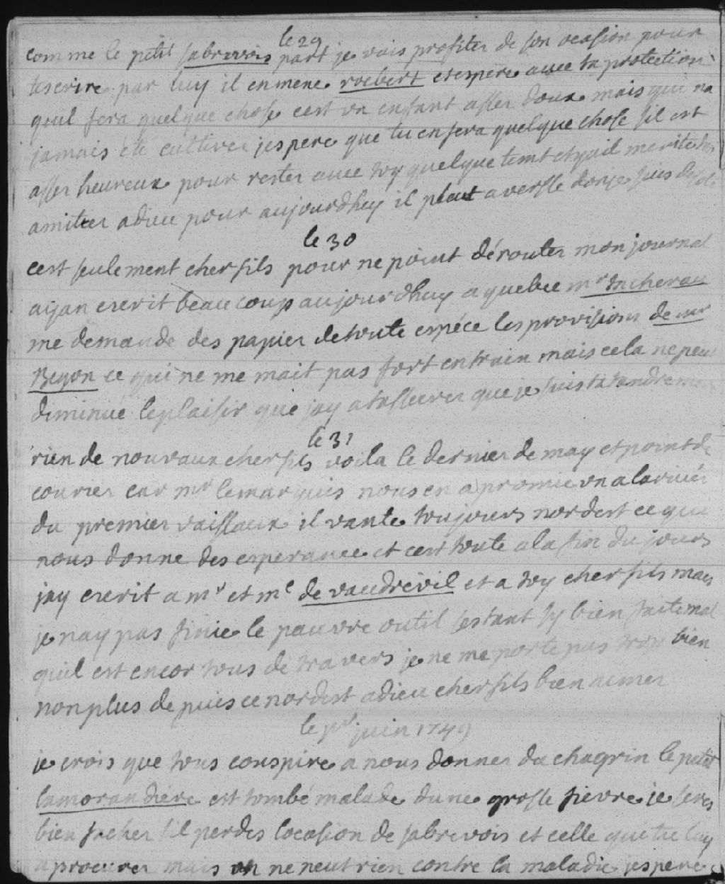 Le petit Sabrevois (Charles de Sabrevois) repart, accompagné de Rocbert (Étienne Rocbert de La Morandière), qui doit aller rejoindre le «fils» (Honoré Michel de Villebois de La Rouvillière). Madame Bégon (Marie-Isabelle-Élisabeth Bégon) espère que celui-ci pourra l'éduquer un peu mieux