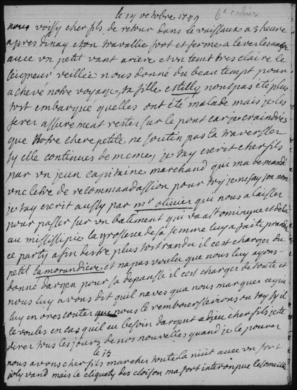 Journal de Madame Bégon, 14 octobre 1749, Archives nationales à Québec, Fonds Famille Bégon, (03Q,P2,P204).