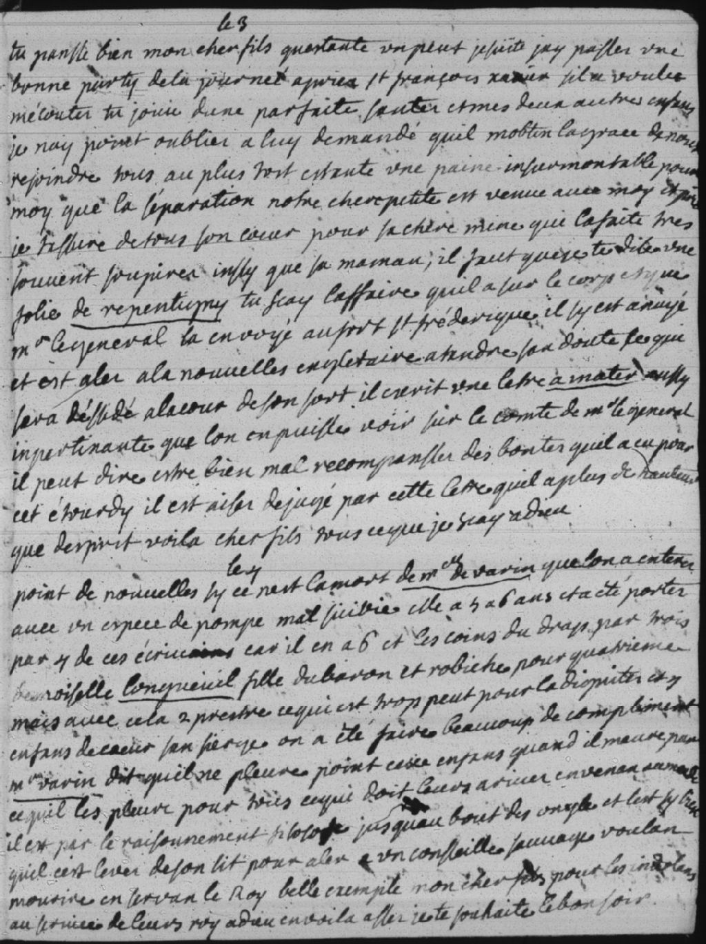 Mademoiselle de Varin est décédée et son enterrement fut célébré avec trop peu de faste, selon Madame Bégon (Marie-Isabelle-Élisabeth Bégon). Elle fut portée par quatre écrivains, les coins du drap par trois demoiselles de Longueuil, filles du baron et Robiche pour quatrième, deux prêtres et quatre enfants de choeur sans cierges. Monsieur de Varin (Jean-Victor Varin de La Marre) ne pleure pas sa fille et décide d'aller à un conseil de sauvages, voulant mourir au service du Roi. Voilà un bel exemple de dévouement selon Madame Bégon