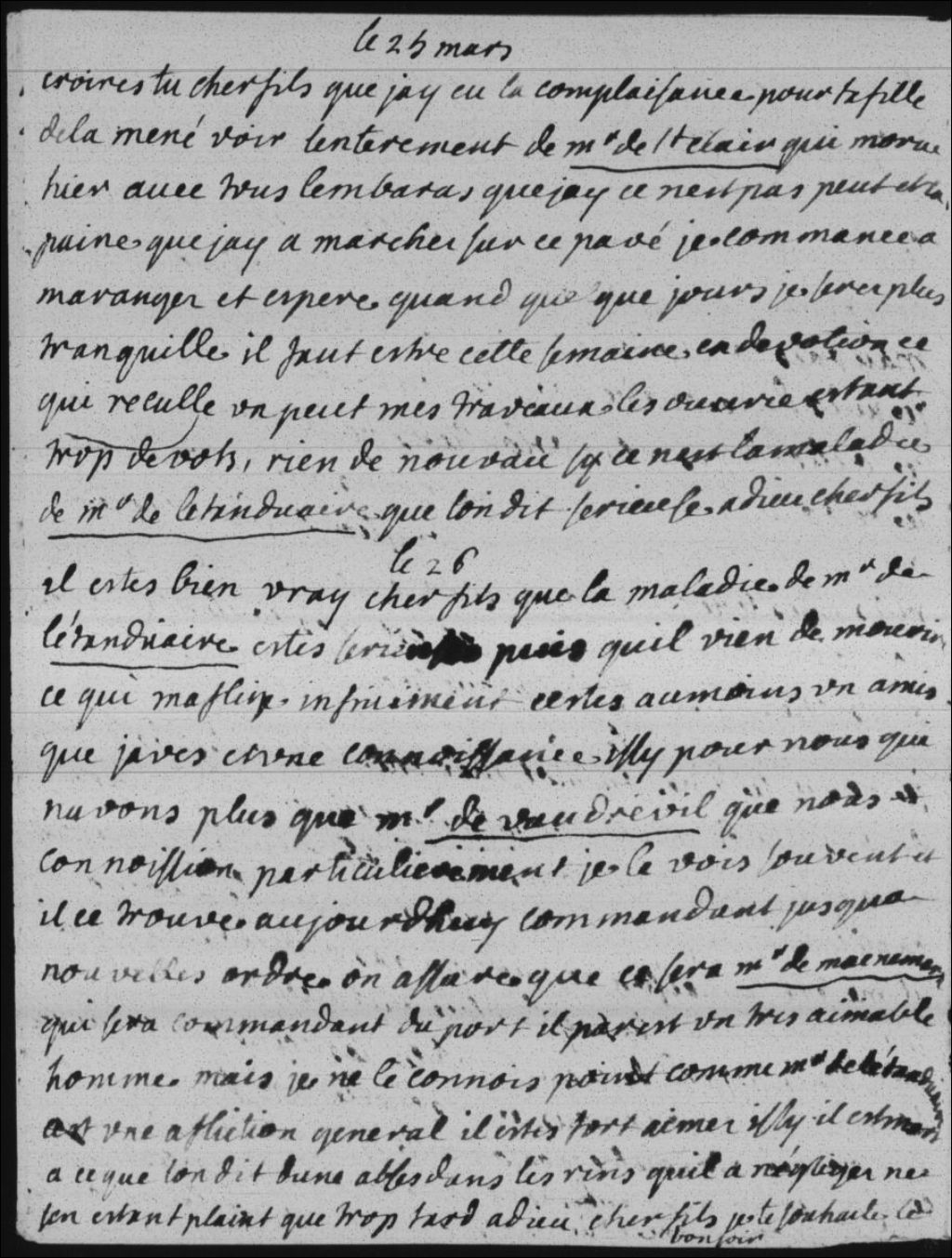 Monsieur de l'Étenduaire est décédé d'un abcès aux reins déclaré trop tard. Madame Bégon (Marie-Isabelle-Élisabeth Bégon) en est chagrinée, car il ne lui reste que Monsieur de Vaudreuil (Pierre Rigaud de Vaudreuil de Cavagnial dit marquis de Vaudreuil) comme connaissance. Monsieur de Macnémara sera le commandant du port