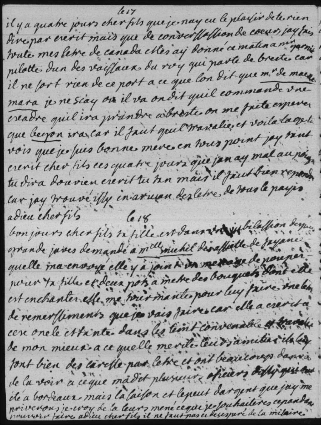 Mademoiselle Michel a envoyé à Madame Bégon (Marie-Isabelle-Élisabeth Bégon) des assiettes de faïence, un ménage de poupée pour la petite (Marie-Catherine de Villebois de La Rouvillière) et des vases pour les fleurs. La petite en est très heureuse et beaucoup de gens désirent l'avoir auprès d'eux, mais le peu d'argent de Madame Bégon les empêchera probablement, la petite et elle, de faire les nombreux voyages