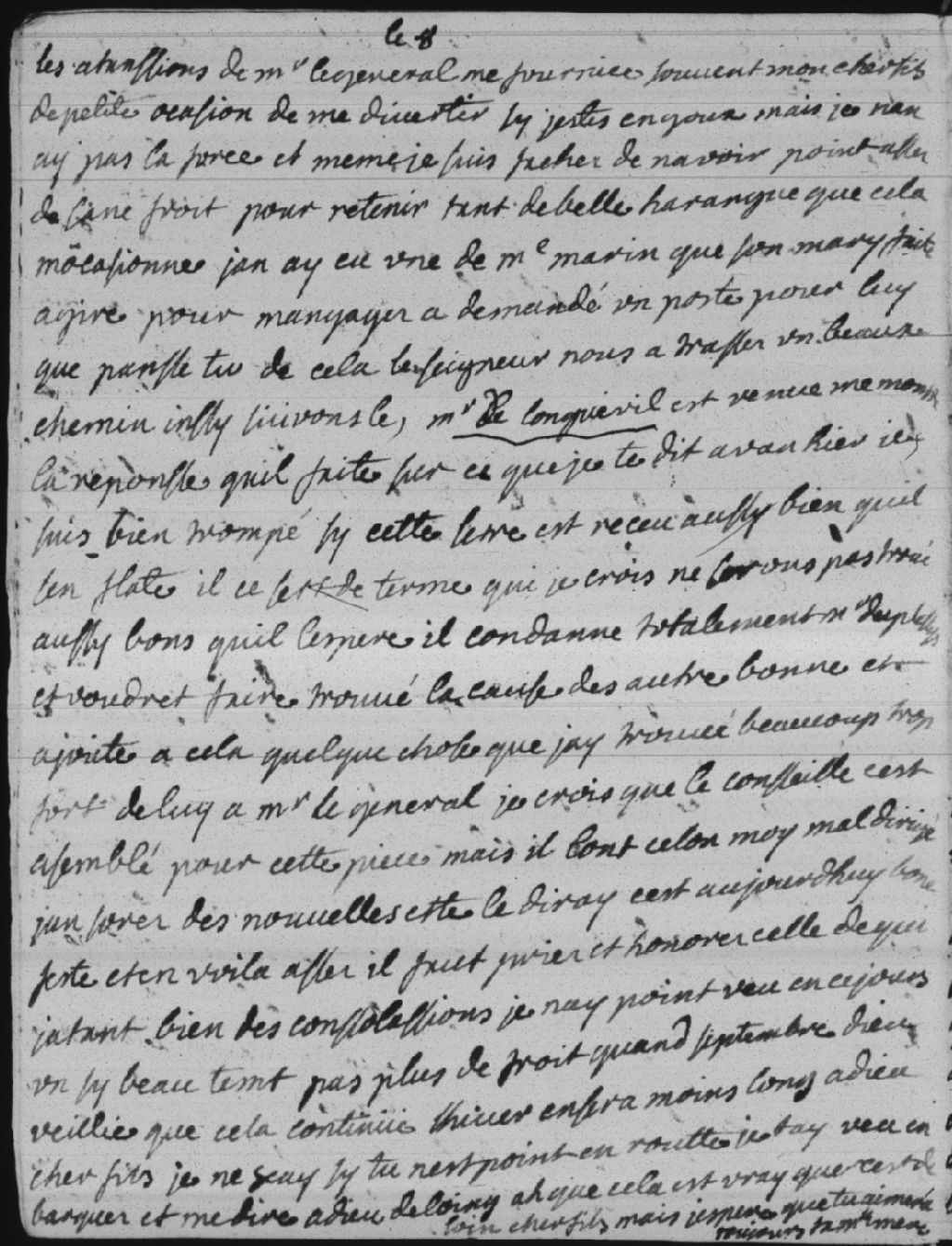 Madame Bégon (Marie-Isabelle-Élisabeth Bégon) se plaint de Madame Marin (Charlotte Marin), qui agit sur ordre de son mari (Joseph Marin de La Malgue) pour que le général (Roland-Michel Barrin de La Galissonière dit marquis de La Galissonière) lui obtienne un poste. Monsieur de Longueuil (Charles Le Moyne de Longueuil) montre une lettre qu'il a écrite au sujet de Monsieur Duplessis (François Lefebvre Duplessis Faber) et le condamne totalement en plus d'avoir des mauvais mots pour le général. Madame Bégon croit que le conseil est réuni pour juger cette lettre