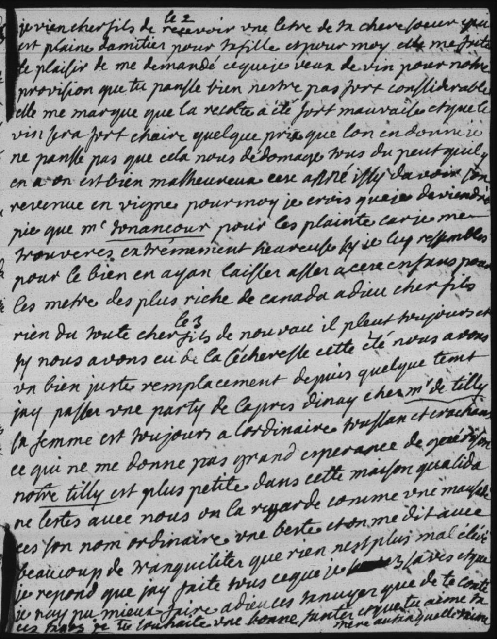 Madame Bégon (Marie-Isabelle-Élisabeth Bégon) passa l'après-midi avec Monsieur de Tilly (Jean-Baptiste Legardeur de Tilly) et apprit que Madame de Tilly (Anne-Geneviève de Tilly) était toujours aussi malade, et qu'elle n'espérait plus la guérison. La petite Tilly (Marie-Anne Legardeur de Moncerville Tilly) ne se porte pas très bien non plus, bien qu'elle ne souffre d'aucune maladie