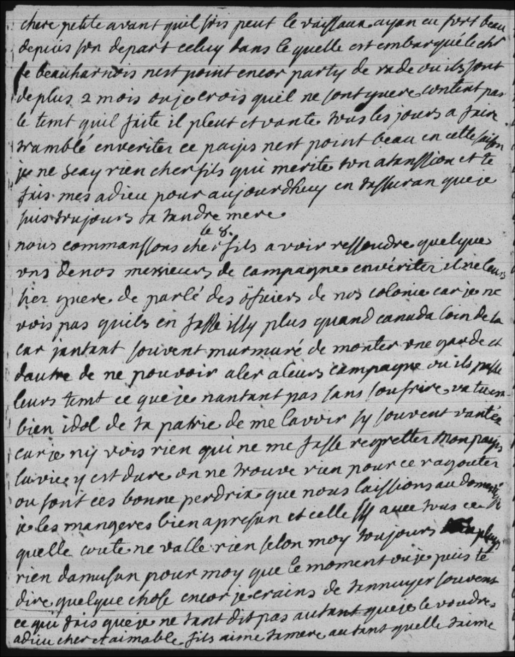 Les hommes de campagne commencent à revenir et Madame Bégon (Marie-Isabelle-Élisabeth Bégon) se plaint de la piètre qualité des aliments qui sont disponibles en France