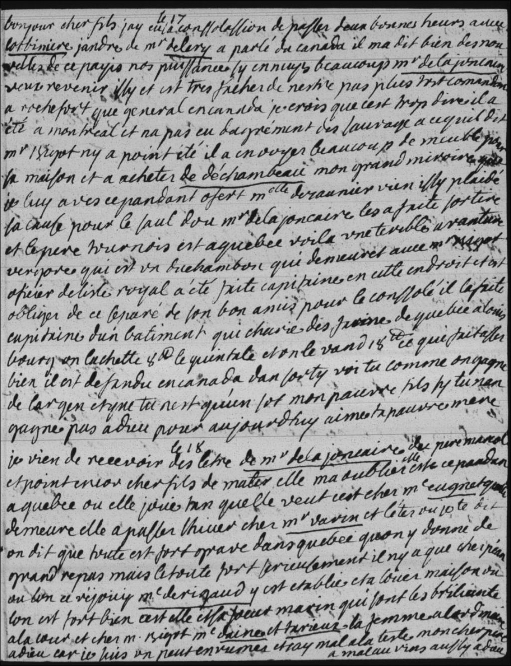 Madame Bégon (Marie-Isabelle-Élisabeth Bégon) a reçu des lettres de Monsieur de La Jonquière (Jacques-Pierres de Taffanel de La Jonquière dit marquis de La Jonquière) et du père Marcol (Gabriel Marcol), et point de Mater (Catherine Legardeur de Repentigny). Celle-ci se trouve à Québec, chez Madame Cugnet, où de nombreuses fêtes sont données. Elles sont toutes sérieuses, sauf celles de Péan (Michel-Jean-Hugues Péan) et de Madame Rigaud. Cette dernière et sa soeur Marin (Charlotte Marin) sont les brillantes à la Cour et chez Monsieur Bigot (François Bigot)