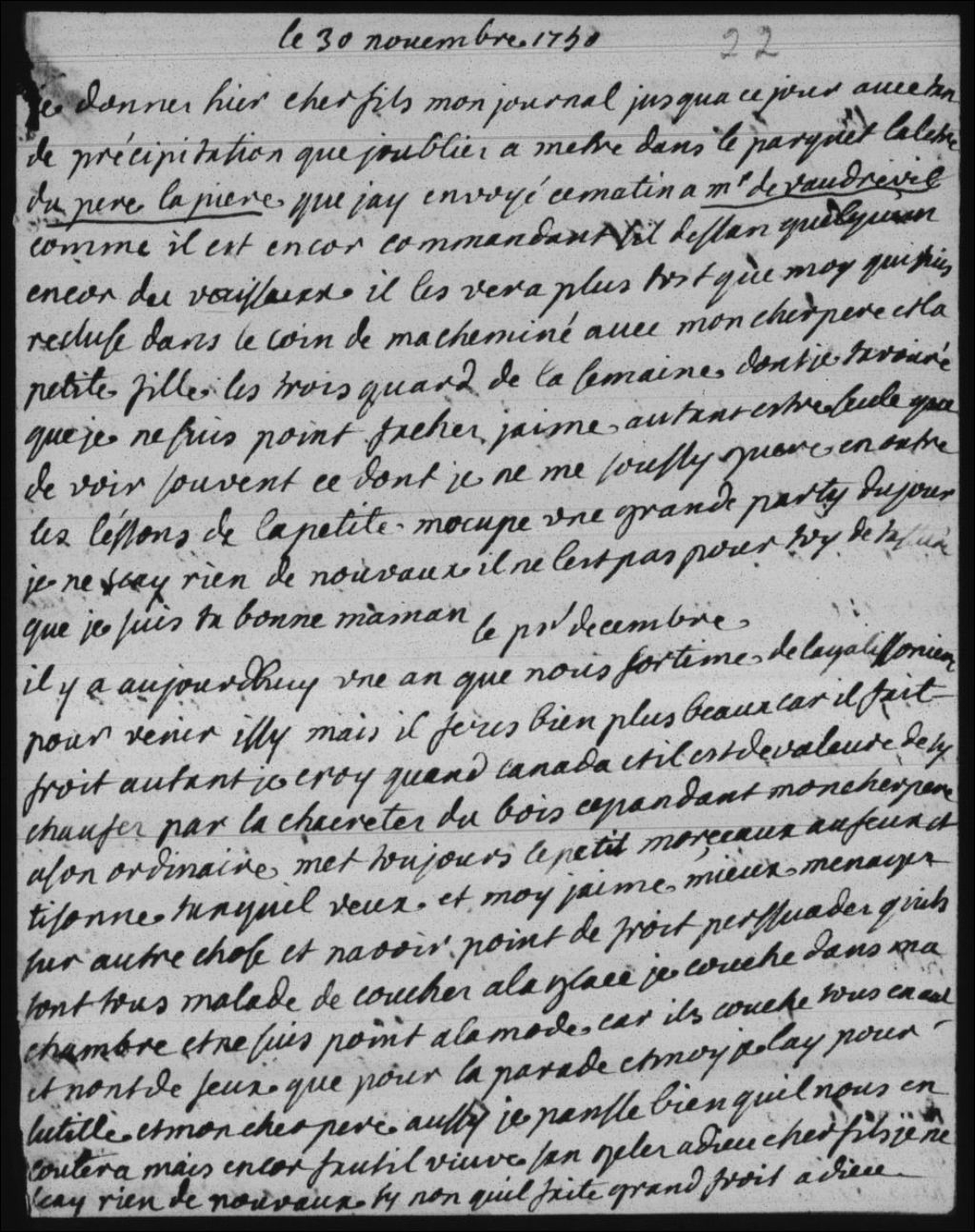 Madame Bégon (Marie-Isabelle-Élisabeth Bégon) envoie à son «fils» (Honoré Michel de Villebois de La Rouvillière) une lettre du père Lapierre par le vaisseau que doit commander Monsieur de Vaudreuil