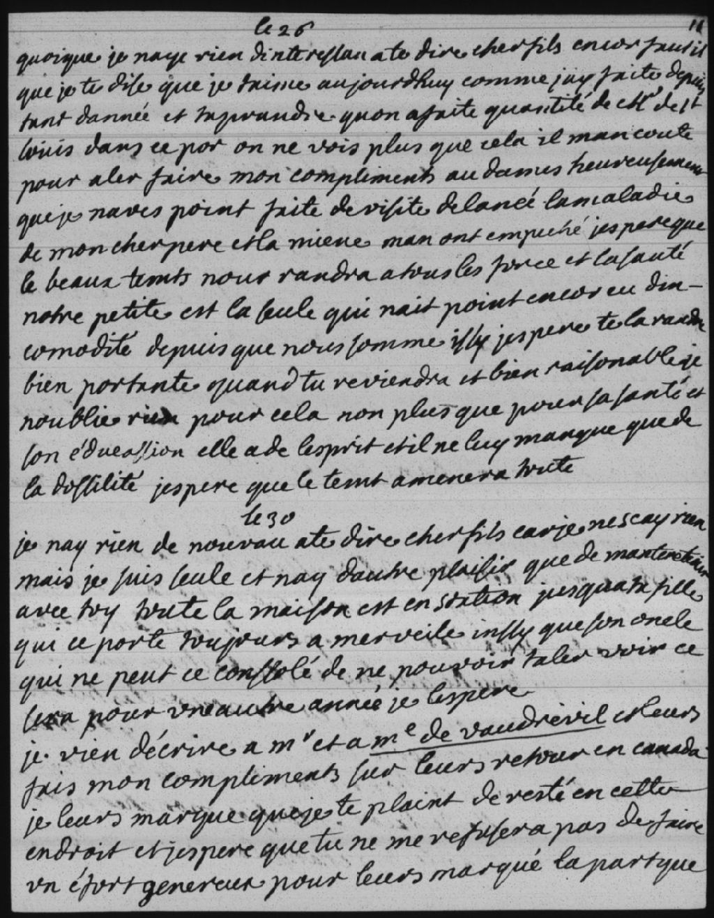 Plusieurs chevaliers de Saint-Louis sont faits dans ce port (le port de Rochefort), et Madame Bégon (Marie-Isabelle-Élisabeth Bégon) doit faire des visites aux dames. Elle n'en a pas fait pendant plusieurs mois en raison de sa maladie et de celle de son père (Étienne Rocbert de La Morandière). Seule la petite (Marie-Catherine de Villebois de la Rouvillière) se porte bien, et Madame Bégon espère la rendre à son «fils» (Honoré Michel de Villebois de la Rouvillière) bien portante et plus docile