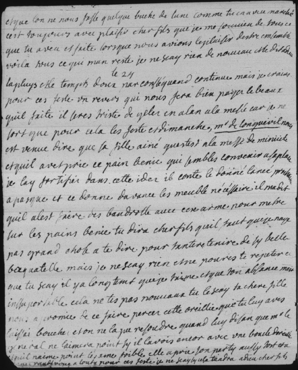 La fille aînée de Monsieur Longueuil (Charles Le Moyne de Longueuil) quêtera à la messe de minuit et celui-ci a promis de faire du pain béni pour Pâques. La petite (Marie-Catherine de Villebois de La Rouvillière) doit se faire percer la seconde oreille et a donc donné rendez-vous à Louty
