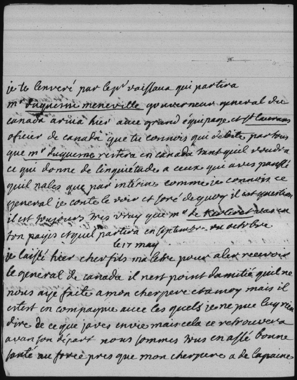 - Monsieur le général (Ange Duquesne de Menneville dit marquis Duquesne) est arrivé et Madame Bégon (Marie-Isabelle-Élisabeth Bégon) et son père (Étienne Rocbert de La Morandière), dont la santé est toujours fragile, sont allés à sa rencontre. La petite (Marie-Catherine de Villebois de La Rouvillière) se porte bien, mais elle ne désire toujours pas apprendre à écrire convenablement, préférant passer son temps à lire. Madame Bégon envoie des vêtements qui seront utiles au cadet La Cousinière
