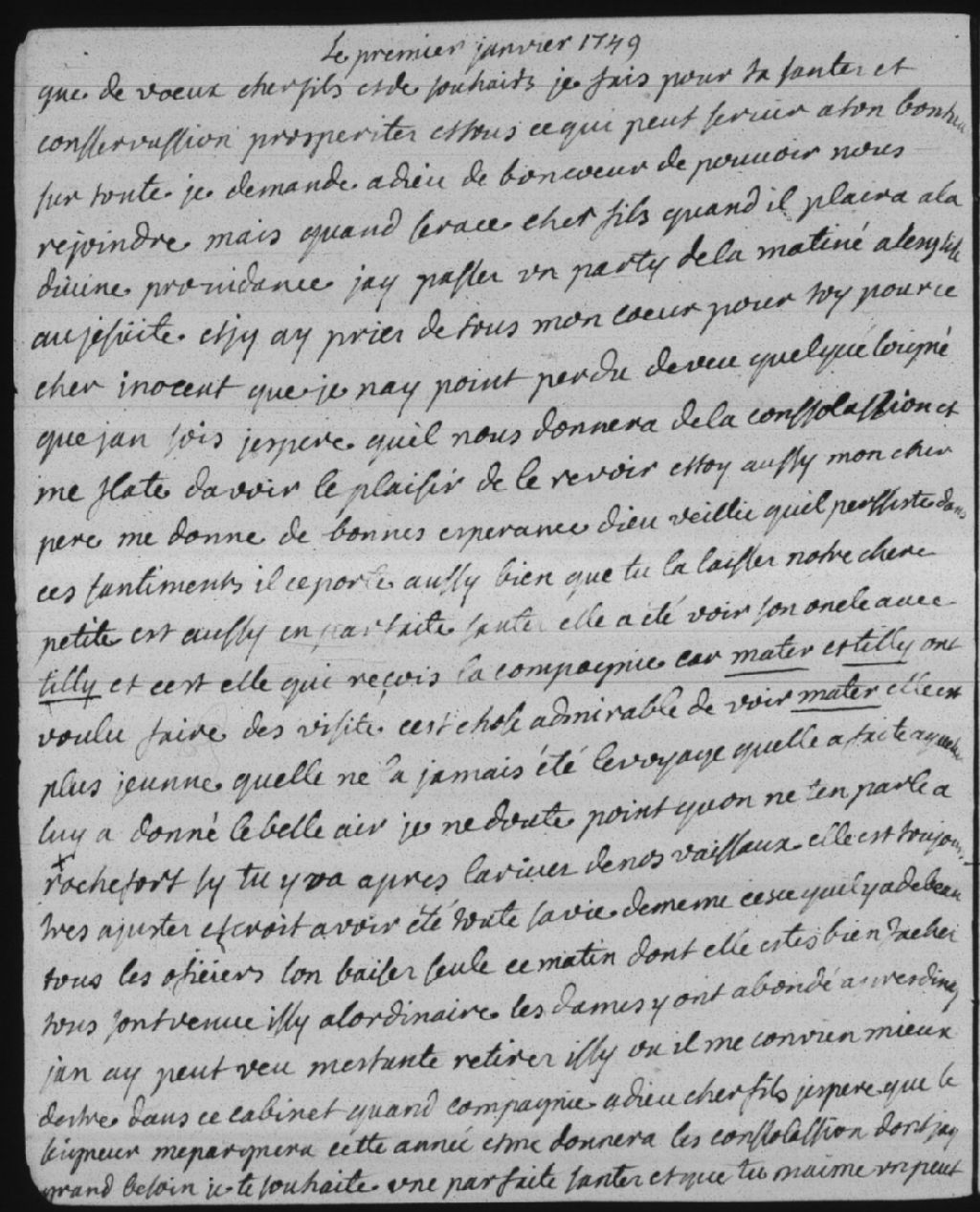 Madame Bégon (Marie-Isabelle-Élisabeth Bégon) passe une partie de la journée à l'église et prie pour le retour de son «fils» (Honoré Michel de Villebois de La Rouvillière), elle lui souhaite la santé et tout ce dont il a besoin. La petite (Marie-Catherine de Villebois de la Rouvillière) est partie faire des visites à la famille accompagnée de Tilly (Marie-Anne Legardeur de Moncerville Tilly). Mater (Catherine Legardeur de Repentigny) est revenue de son voyage à Québec en meilleure santé