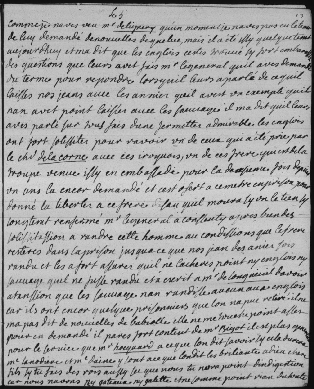 - Monsieur de Ligneris (François-Marie Le Marchand de Lignery) relate la rencontre entre le général (Roland-Michel Barrin de La Galissonière dit marquis de La Galissonière) et un ambassadeur anglais en mission à Québec. Monsieur le général aurait été très ferme avec les Anglais au sujet des Français qui sont toujours prisonniers des Agniers. Un soldat anglais aurait demandé à prendre la place de son frère qui est en prison avec des Iroquois. Monsieur le général aurait accepté l'échange, mais en précisant qu'aucun Anglais ne serait libéré avant la libération des Français. Selon les dires, Monsieur Bigot (François Bigot) serait plus indulgent et aimable que Monsieur Hocquart (Gilles Hocquart) pour le service. Madame Bégon (Marie-Isabelle-Élisabeth Bégon) n'a rien pu donner pour la fête des Rois