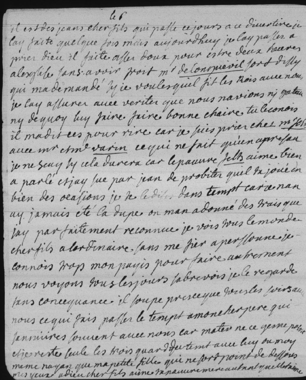 Monsieur de Longueuil (Charles Le Moyne de Longueuil) est invité à fêter les Rois chez Monsieur Feltz (Charles-Elemy-Joseph-Alexandre-Ferdinand Feltz) avec Monsieur et Madame Varin (Jean-Victor Varin de La Marre et Charlotte Varin). Tous les jours, Sabrevois (Charles de Sabrevois) vient souper à la maison et égayer le père de Madame Bégon (Étienne Rocbert de La Morandière) qui, pour sa part, surveille toujours la petite (Marie-Catherine de Villebois de La Rouvillière)