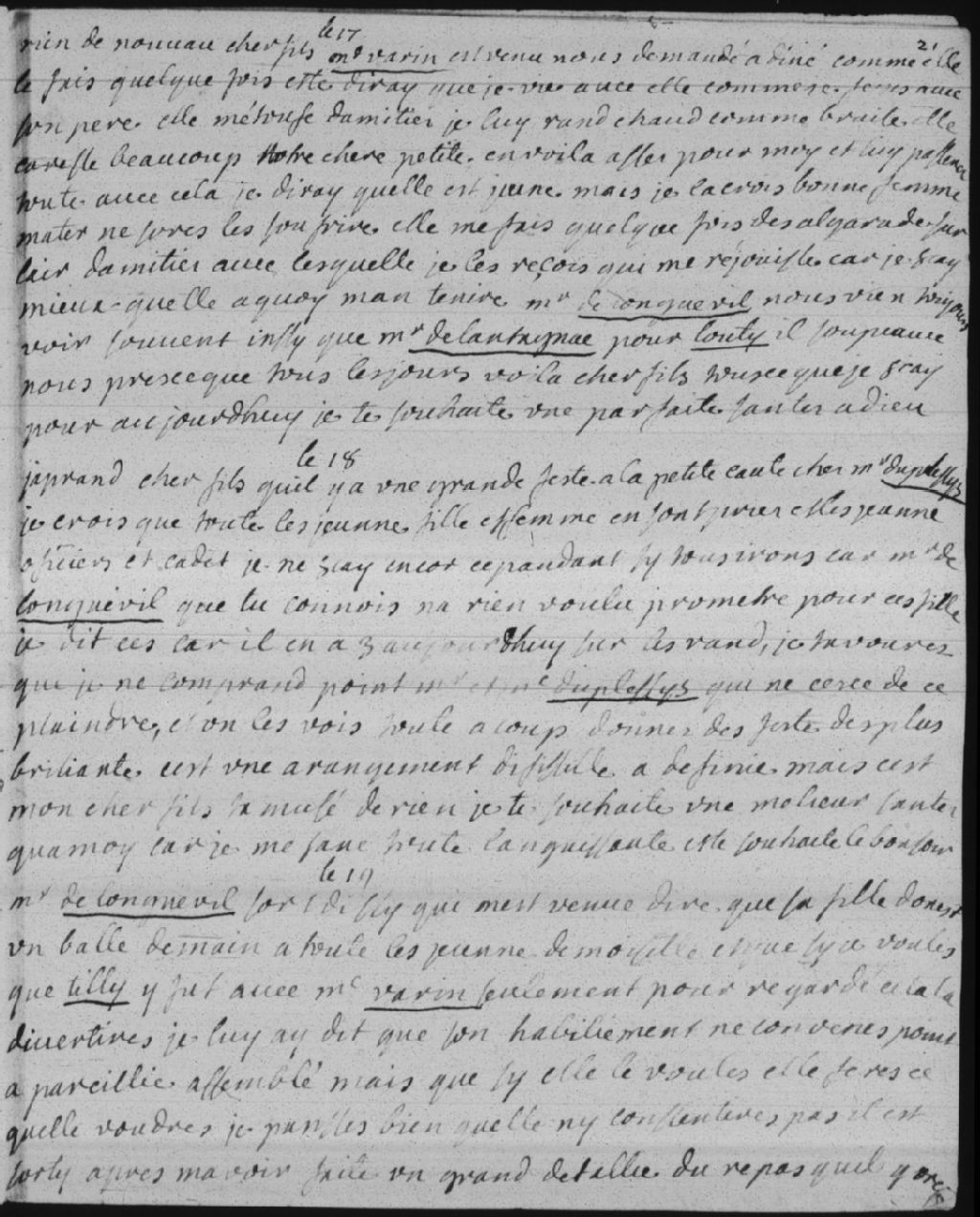 Madame Bégon (Marie-Isabelle-Élisabeth Bégon) a reçu la viste de Madame Varin (Charlotte Varin), qui l'étouffe d'amitiés et caresse beaucoup la petite (Marie-Catherine de Villebois de La Rouvillière), Messieurs de Longueuil (Charles Le Moyne de Longueuil) et Lantagnac (Gaspard Adhémar de Lantagnac) viennent régulièrement faire une visite et Louty vient souper régulièrement