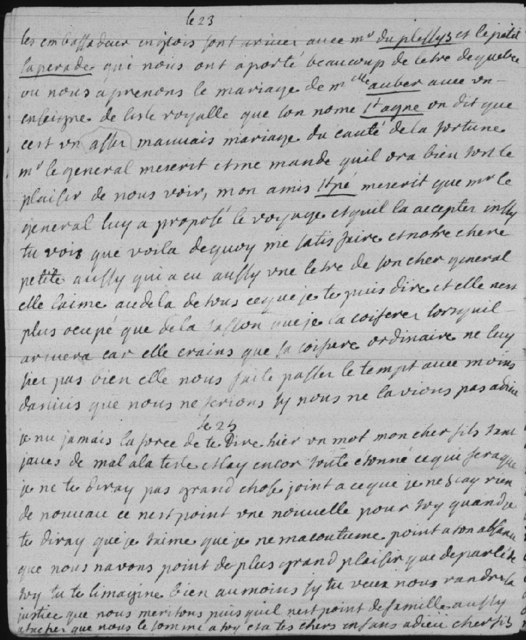 Journal de Madame Bégon, 23 janvier 1749, Archives nationales à Québec, Fonds Famille Bégon, (03Q,P2,P72).