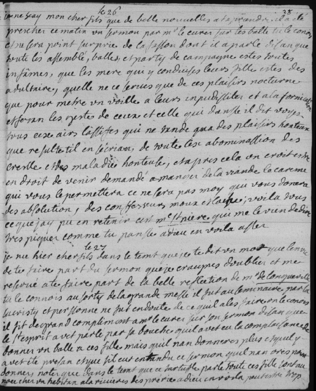 Monsieur de Longueuil (Charles Le Moyne de Longueuil) félicite le curé pour son sermon contre les festivités et jure que s'il avait entendu ce sermon avant, il n'aurait jamais donné de bal pour ses filles: pendant ce temps, ses trois filles sont à une noce à la Rivière-des-Prairies