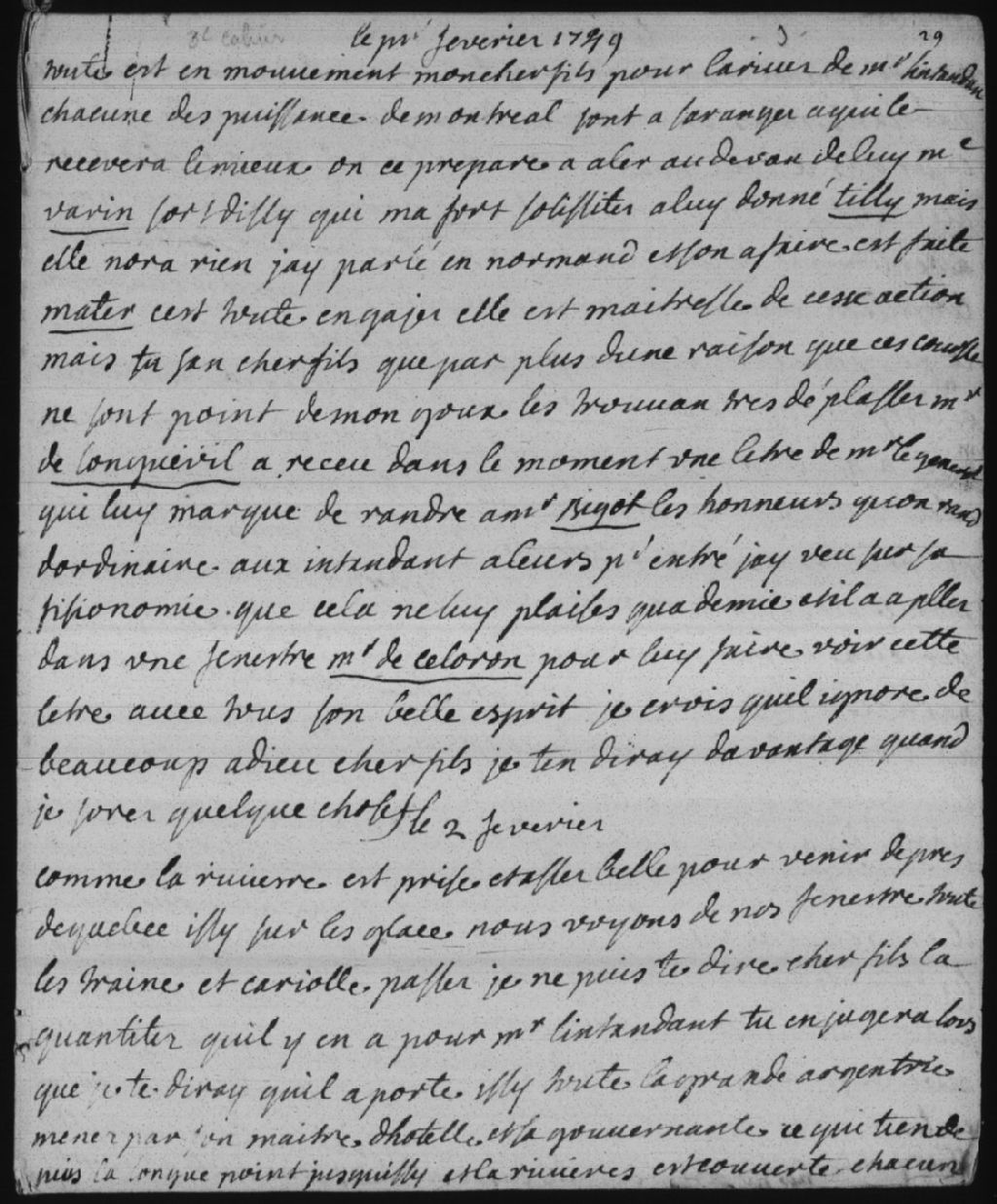 Montréal est en effervescence avant l'arrivée de l'intendant (François Bigot). Chacune des puissances de la ville fait tout ce qu'elle peut pour l'accueillir le mieux possible: Monsieur de Longueuil (Charles Le Moyne de Longueuil) a reçu une lettre du général (Roland-Michel Barrin de La Galissonière dit marquis de La Galissonière) lui rappelant qu'il doit faire tous les honneurs se rattachant à la première année en poste d'un intendant. Madame Varin (Charlotte Varin) aurait bien voulu avoir Tilly (Marie-Anne Legardeur de Moncerville Tilly) pour ses besognes, mais Madame Bégon (Marie-Isabelle-Élisabeth Bégon) s'y est opposée