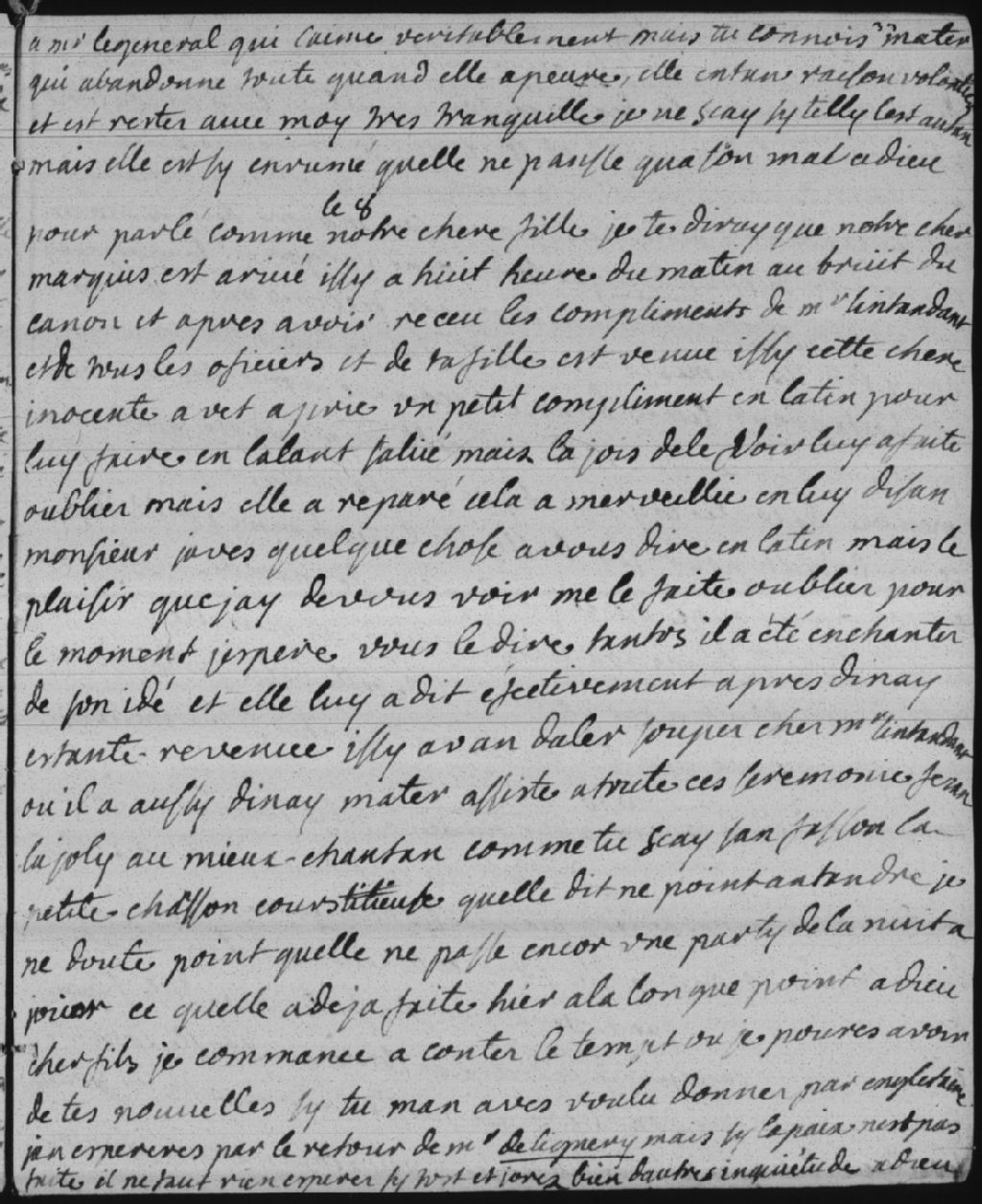 Le marquis (Roland-Michel Barrin de La Galissonière dit marquis de La Galissonière) est arrivé vers huit heures du matin au son du canon. Il fut accueilli par l'intendant (François Bigot) et par tous les officiers de la ville, ainsi que par la petite ( Marie-Catherine de Villebois de La Rouvillière). Monsieur le général est venu dîner chez Madame Bégon (Marie-Isabelle-Élisabeth Bégon) avant de retourner chez Monsieur l'intendant, où il a à nouveau dîné. Mater (Catherine Legardeur de Repentigny) assiste à toutes ces cérémonies et joue très tard chaque soir