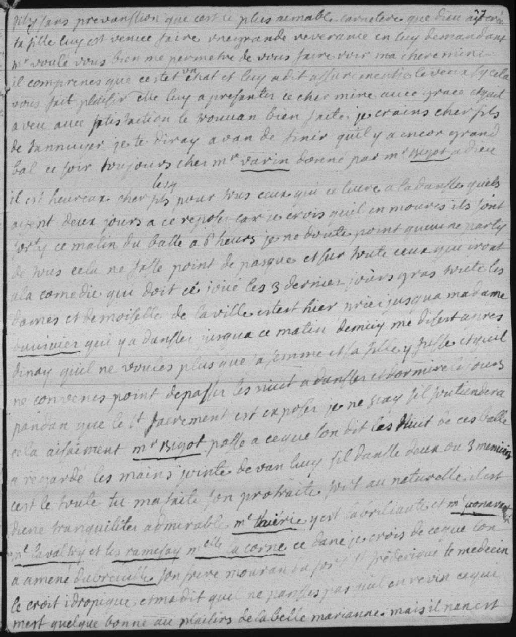 Il y a de nombreux bals à Montréal: tous finissent très tard dans la nuit, et toutes les dames et demoiselles y sont conviées. Monsieur Bigot (François Bigot) passe ses nuits à regarder les autres danser, lui qui se contente de deux ou trois menuets. Mademoiselle de La Corne a le coeur trop lourd pour danser, on vient de ramener son frère blessé du Fort Saint-Frédéric. Le médecin le croit hydropique et ne croit pas qu'il va survivre. La petite (Marie-Catherine de Villebois de la Rouvillière) a demandé la permission d'aller jeter un coup d'oeil sur le bal par la fenêtre à Madame Bégon (Marie-Isabelle-Élisabeth Bégon). Elle y est allée, mais préfère rester à la maison