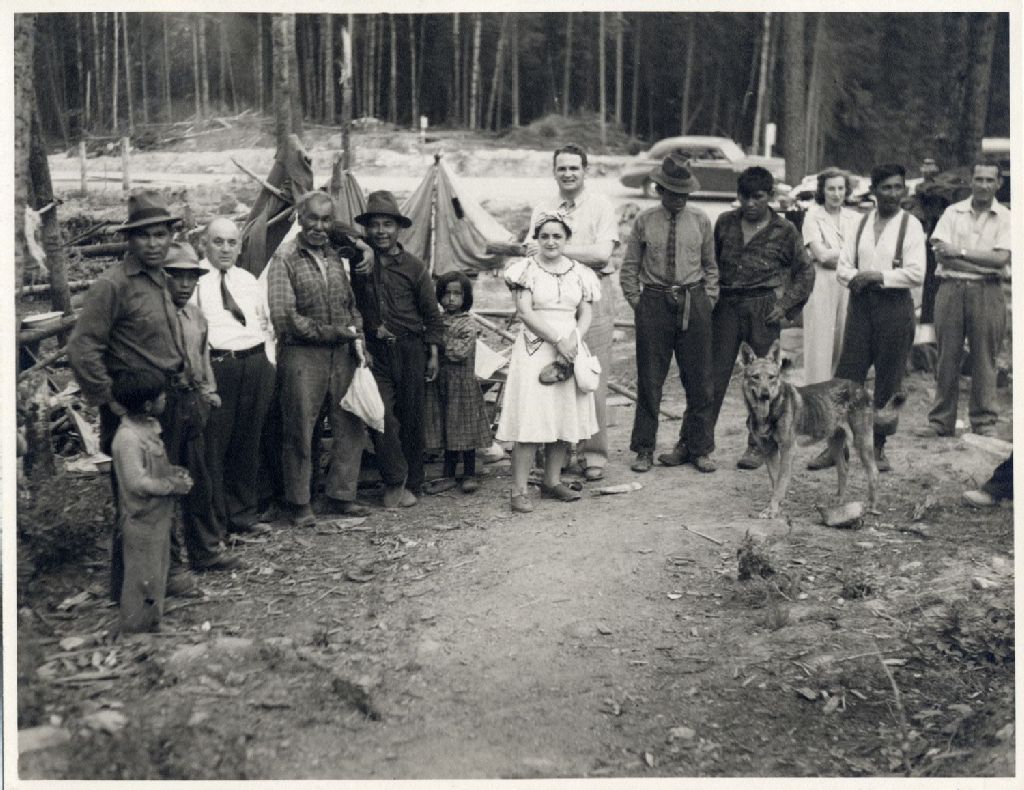 T.-D. Bouchard, ministre de la Voirie, et Cécile-Éna Bouchard sur un chantier (amérindiens), [1940?], Archives nationales à Québec, Fonds Télesphore-Damien Bouchard, (03Q,P10,S1,P191), Photographe non identifié.