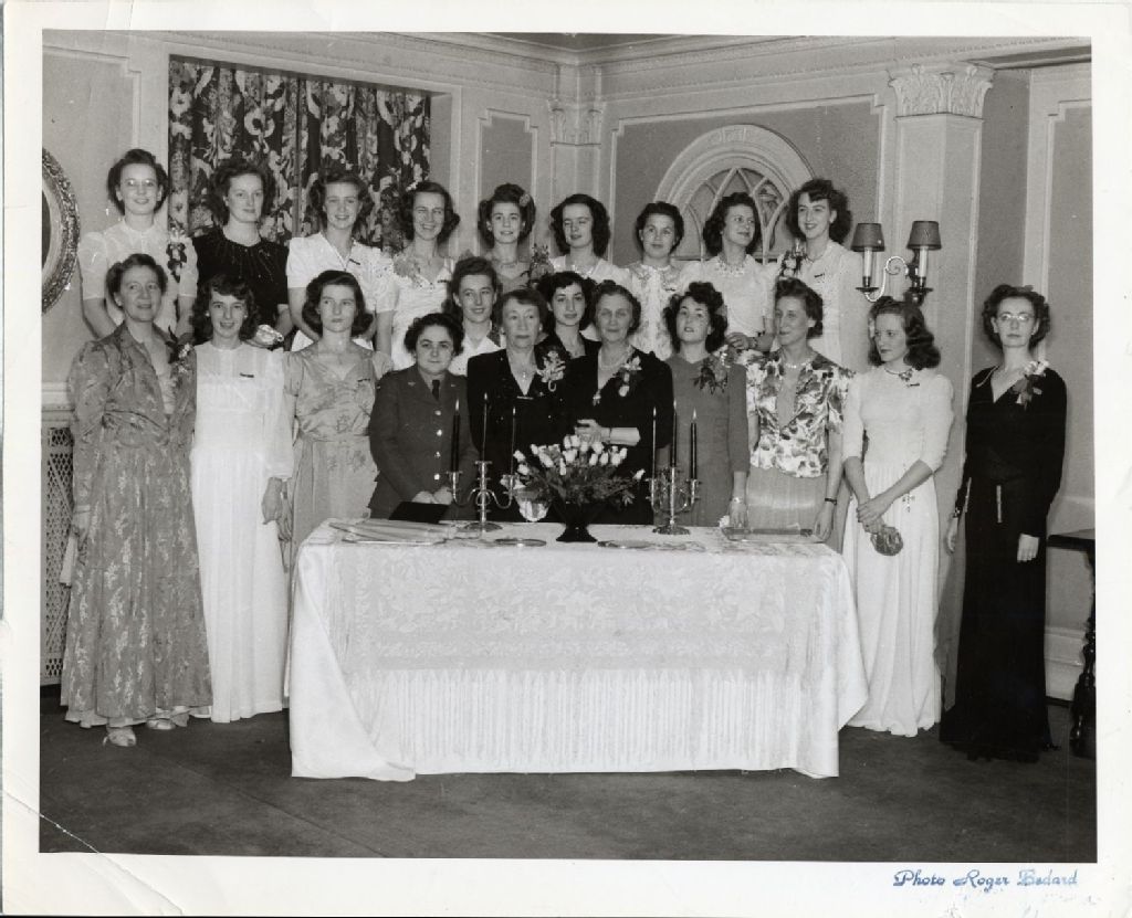 Cécile Bouchard, en tenue militaire, avec un groupe de femmes en tenue de soirée