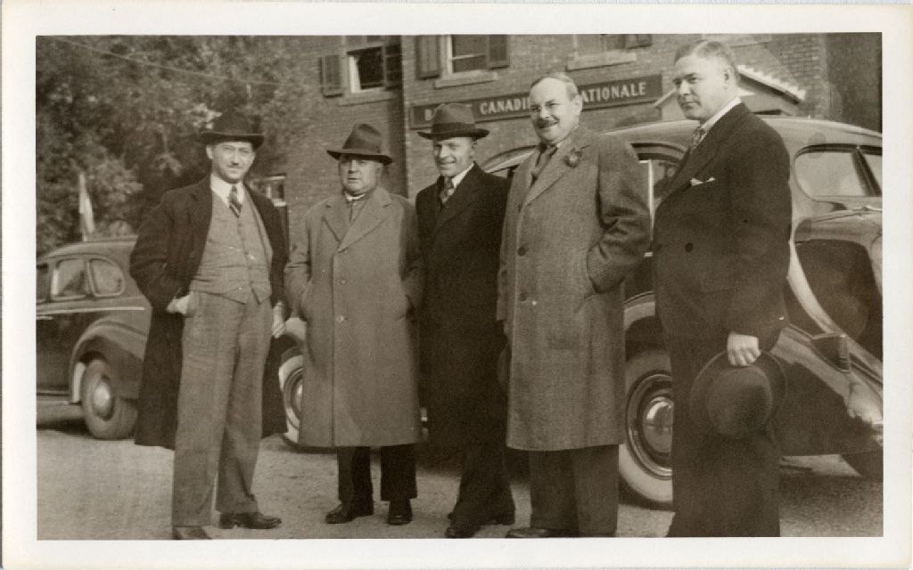 Cinq hommes devant la Banque canadienne nationale, de gauche à droite : homme non-identifié, T.-D Bouchard, Adélard Godbout, Edgar Rochette et un autre homme non-identifié