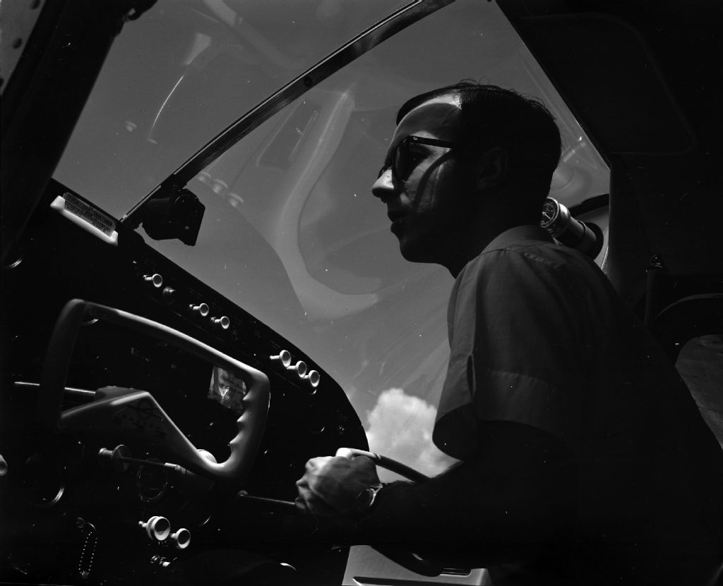 J. M. Beaudet, pilote, aux commandes d'un avion