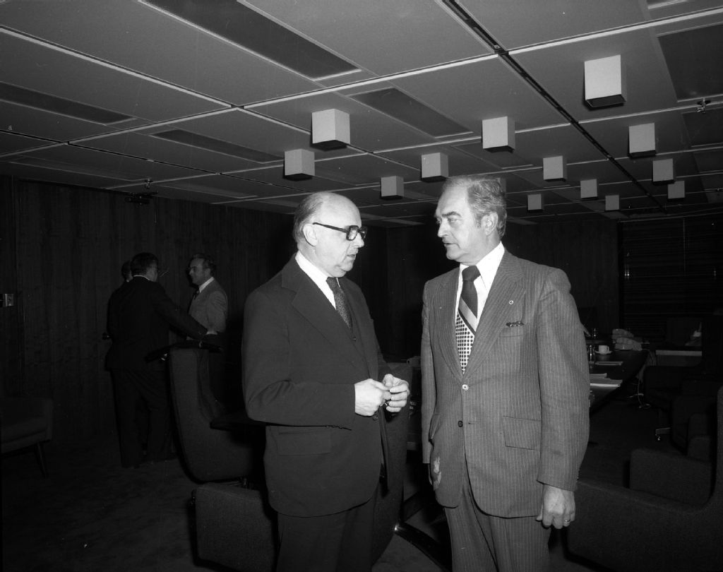 Le maire de Montréal, Jean Drapeau et le maire de Pointe-aux-Trembles, Bernard Benoît, au cours d'une réunion du Conseil de la Communauté urbaine de Montréal au Complexe Desjardins, rue Sainte-Catherine à Montréal, 28 octobre 1976, Archives nationales à Montréal, Fonds Armour Landry, (06M,P97,S1,D1082-1082), Armour Landry.