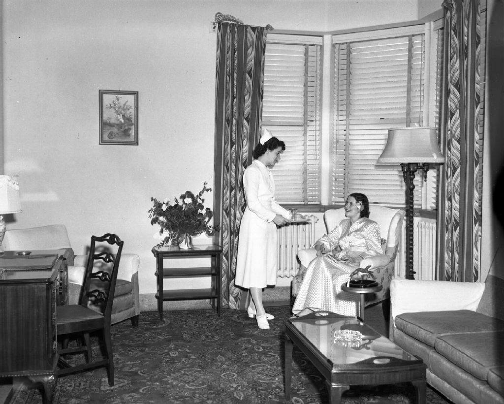 Un salon de réception pour les visiteurs à l'Hôtel-Dieu de Montréal, [Vers 1960], Archives nationales à Montréal, Fonds Armour Landry, (06M,P97,S1,D10898-10898), Armour Landry.