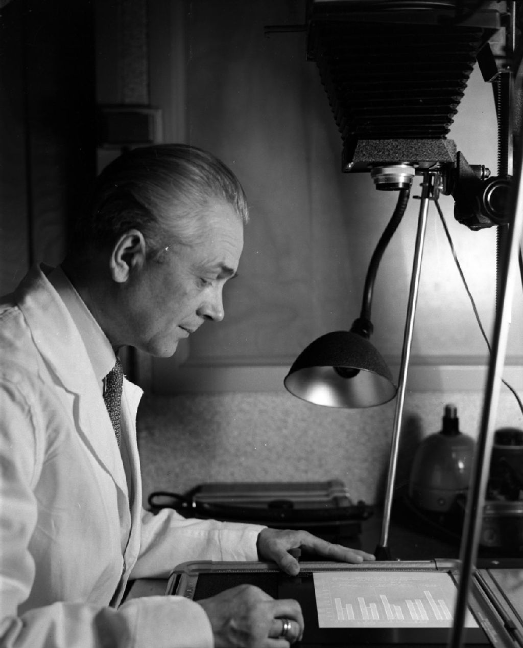 - Nous voyons des laborantins, dont le docteur Jacques Genest, travailler sur diverses expériences. Nous voyons également un médecin interroger un patient, une femme tapper à la machine et un chien sur une table d'opération