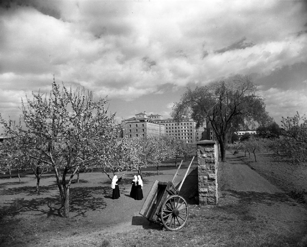 - Nous voyons les soeurs et les pommiers en fleurs à l'arrière du jardin du couvent