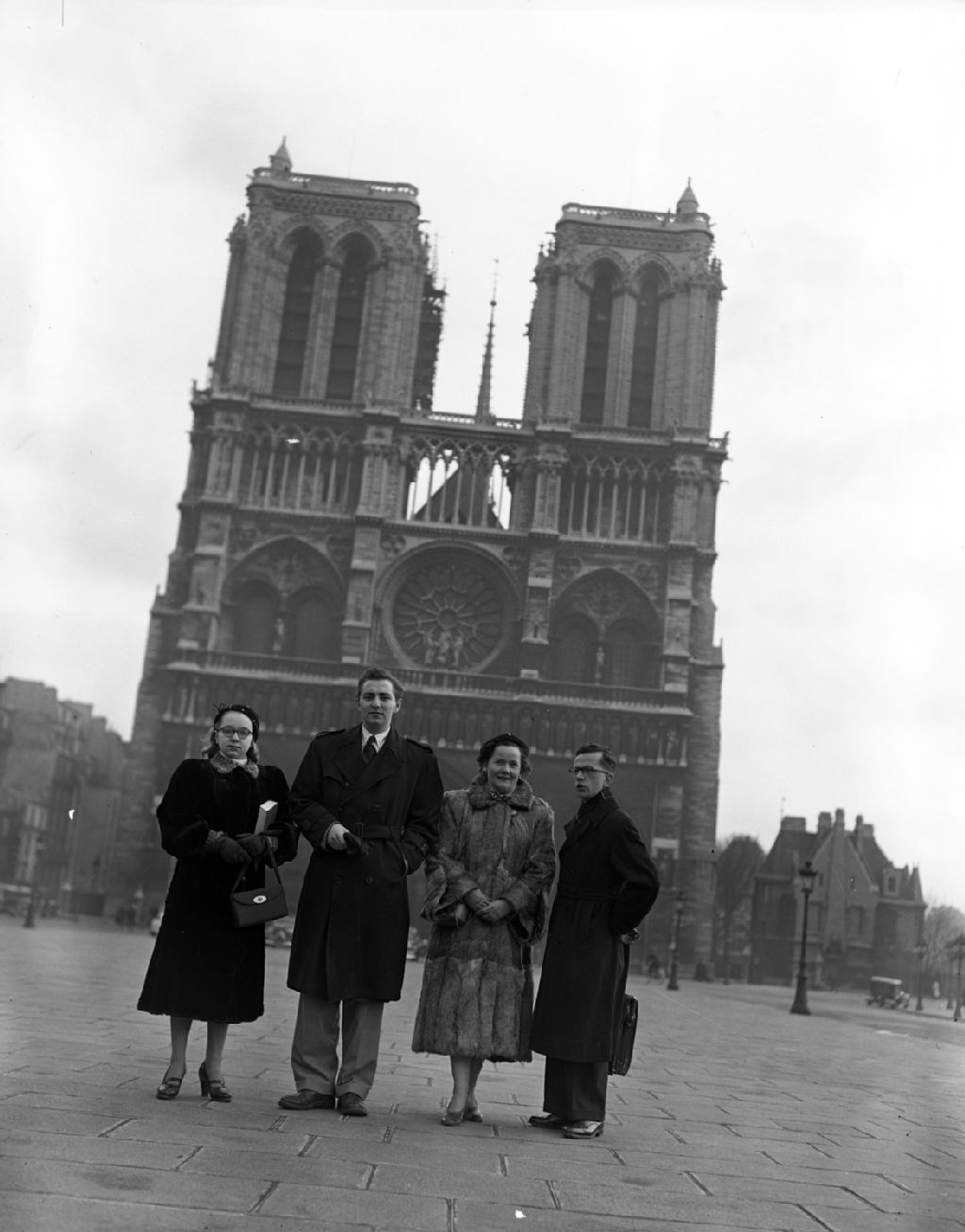 Quatre personnes posent devant la cathédrale Notre-Dame de Paris