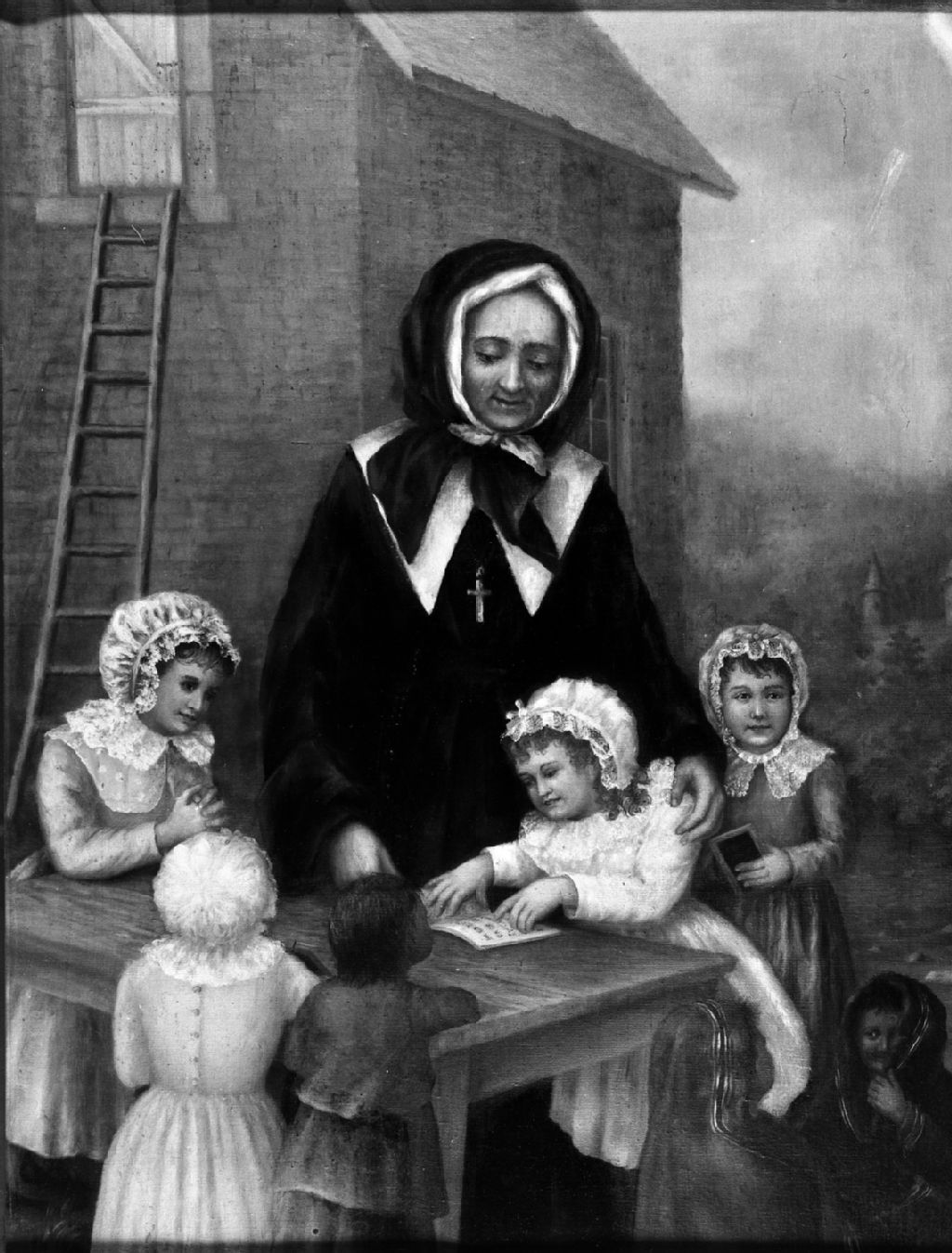 Il s'agit d'une copie photographique d'un tableau représentant Marguerite Bourgeoys, la fondatrice de la Congrégation de Notre-Dame à Montréal, aidant ses élèves