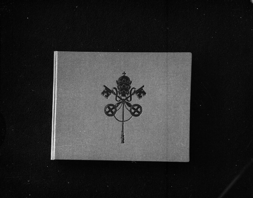 L'album commémoratif présenté au pape Jean XXIII pour le jubilé du sanctuaire de la reine des écoles, par l'Oeuvre de Notre-Dame-des-Écoles appartenant à la Congrégation de Notre-Dame à Montréal, [Vers 1960], Archives nationales à Montréal, Fonds Armour Landry, (06M,P97,S1,D12816-12817), Armour Landry.