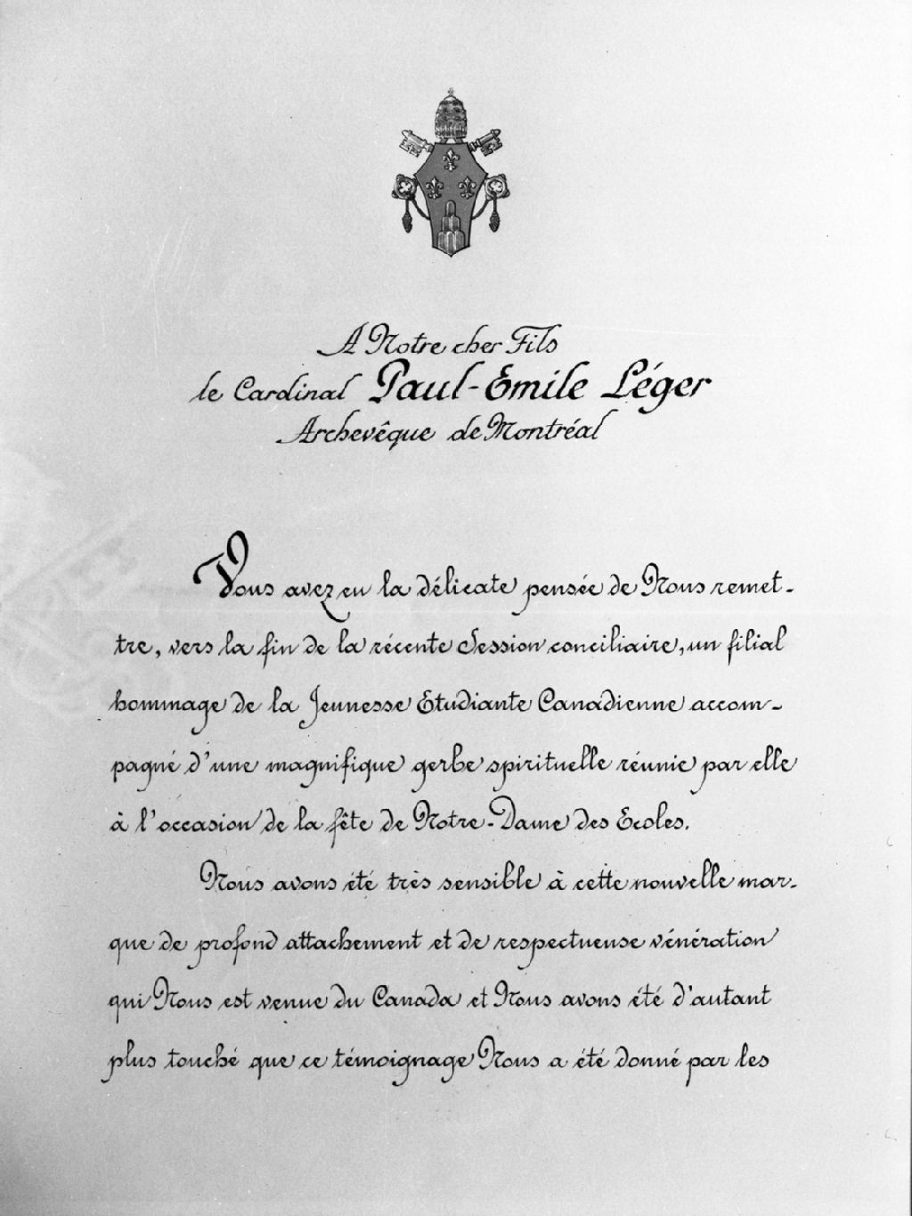 - Il s'agit d'une lettre datée du 26 novembre 1964 et signée par le pape Paul VI, remerciant le cardinal Paul-Émile Léger et la jeunesse étudiante catholique du Canada, pour un présent envoyé à l'occasion de la fête de Notre-Dame-des-Écoles