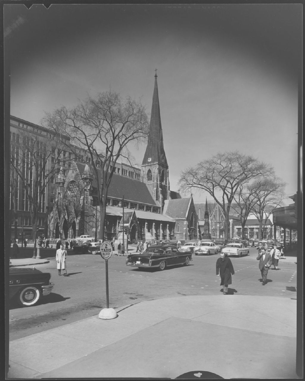 La Christ Church Cathedral, au coin des rues Union et Sainte-Catherine à Montréal, 1950, Archives nationales à Montréal, Fonds Armour Landry, (06M,P97,S1,D14132-14132), Armour Landry.