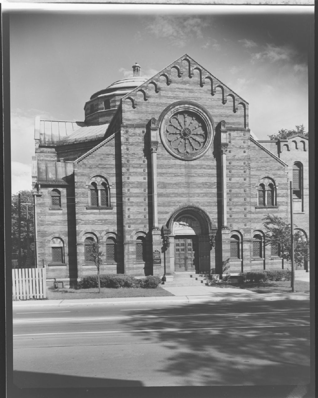 Vue extérieure du temple Emmanuel, situé sur la rue Sherbrooke à Westmount, Montréal, 1950, Archives nationales à Montréal, Fonds Armour Landry, (06M,P97,S1,D14156-14157), Armour Landry.